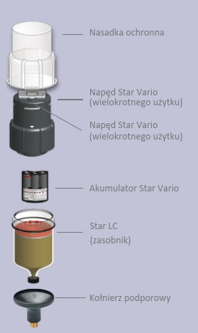 Smarownice Xport® Star Vario to elektromechaniczne systemy automatycznego dozowania środków smarnych. System składa się z zespołu napędowego wielokrotnego użytku, wymiennego wkładu smarującego oraz akumulatora litowego lub alkalicznego. Urządzenie wyposażone jest w wyświetlacz LCD z przyciskiem ustawień umożliwiający wybór czasu rozładowania oraz pojemności wkładu. Stan pracy sygnalizowany jest diodą LED widoczną dookoła urządzenia. Czas rozładowania można ustawić od jednego do dwudziestu sześciu tygodni oraz od jednego do dwunastu miesięcy.